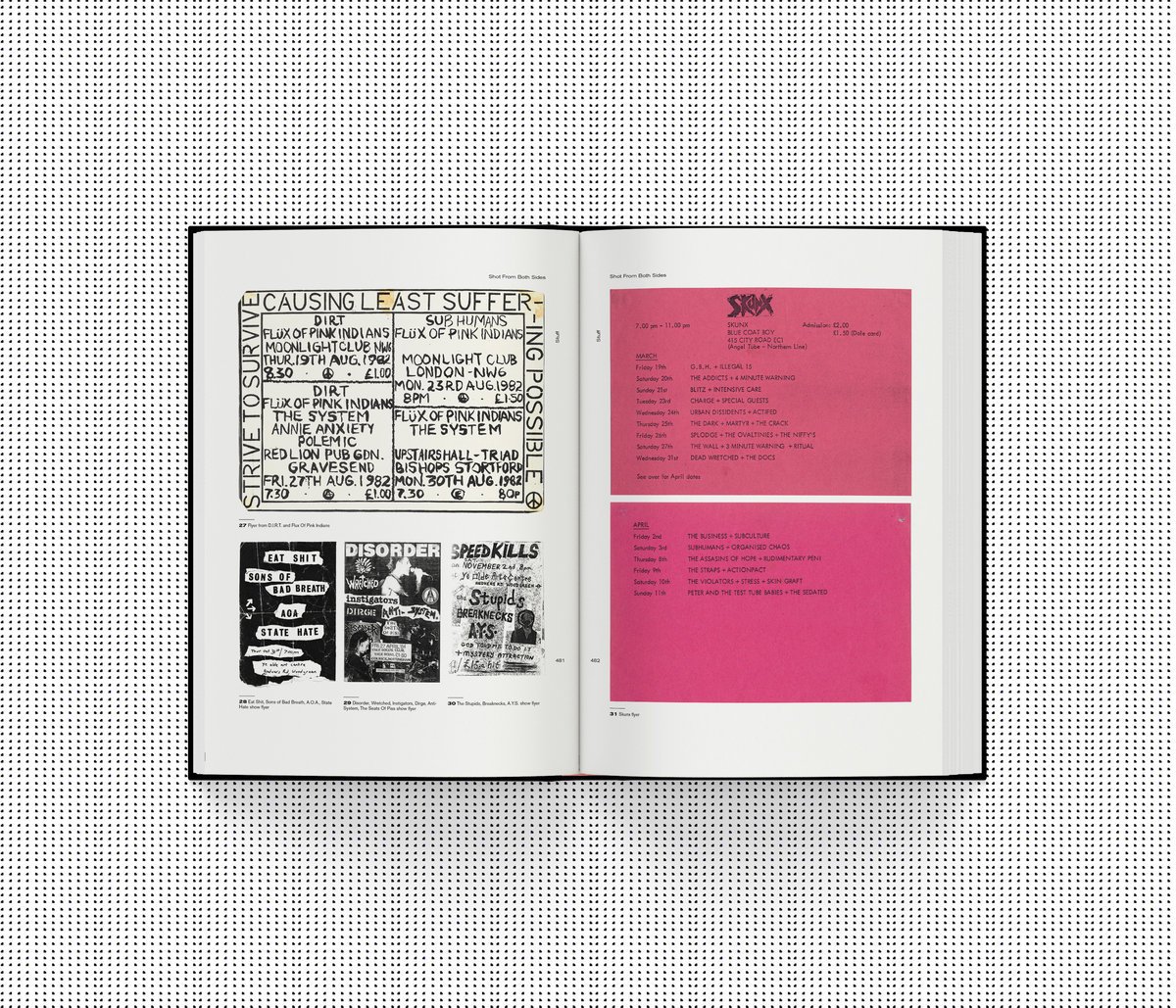 SHOT FROM BOTH SIDES is based around the live gig photography of Paul May, a punk from Grays, Essex, in the UK. In the 80s, Paul took hundreds of photos of punks, and punk bands, documented the gigs he saw, ran a tape label, and did the cult punk fanzine Final Curtain. Ordered chronologically, SHOT FROM BOTH SIDES sets the tone for each year from 1981 to 1986 with a recap of important historic and political events, notable records, tapes, and fanzines that were released. Each section of photos culminates with personal memoirs from a diverse mixture of figures and band members giving context to the photos, gigs, the era, and spilling forth some great stories that you won’t likely get elsewhere, and features a selection of relevant ephemera and additional photos, from unseen Nick Blinko sketches to flyers, ticket stubs, and set lists of bands large and small.